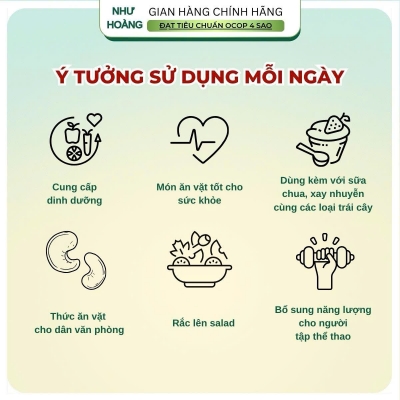 - Có thể dùng như món ăn vặt, kết hợp trong salad, ngũ cốc, hoặc ăn cùng sữa chua. Đóng kín nắp sau mỗi lần sử dụng để giữ độ giòn và hương vị thơm ngon.