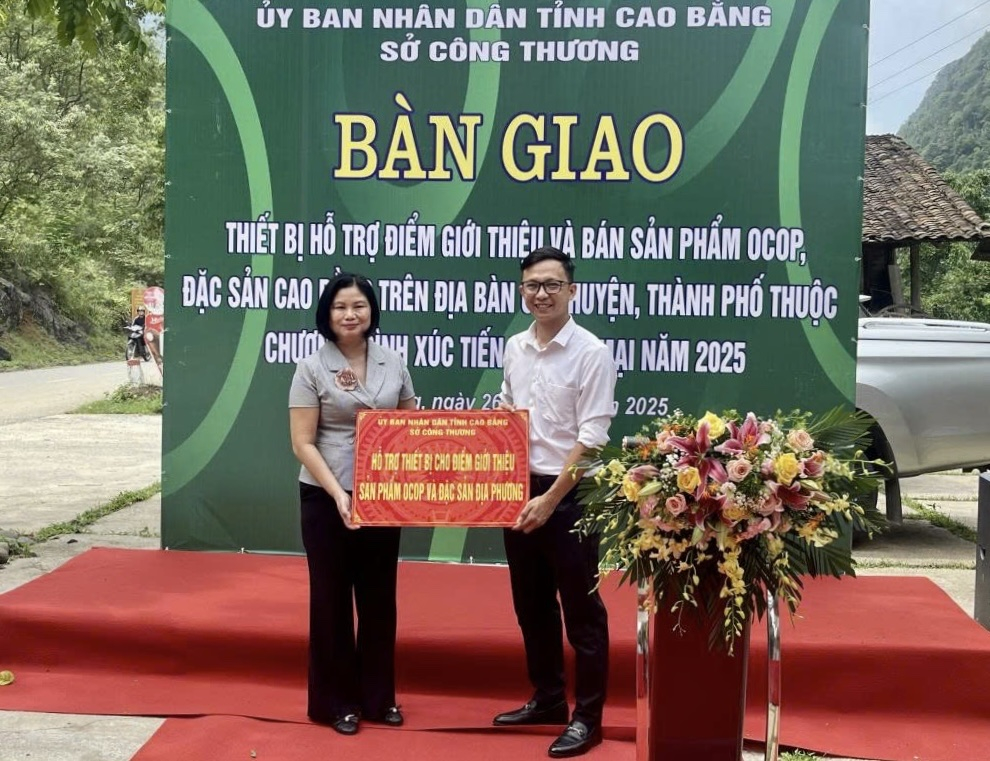 Ngày 26/6, tại Hợp tác xã Pá Mế, xã Trường Hà (Hà Quảng), Sở Công thương tổ chức bàn giao thiết bị hỗ trợ điểm giới thiệu và bán sản phẩm OCOP đặc sản Cao Bằng trên địa bàn các huyện, thành phố thuộc chương trình xúc tiến thương mại năm 2025. Tham dự có lãnh đạo một số sở, ngành và, hợp tác xã, doanh nghiệp.