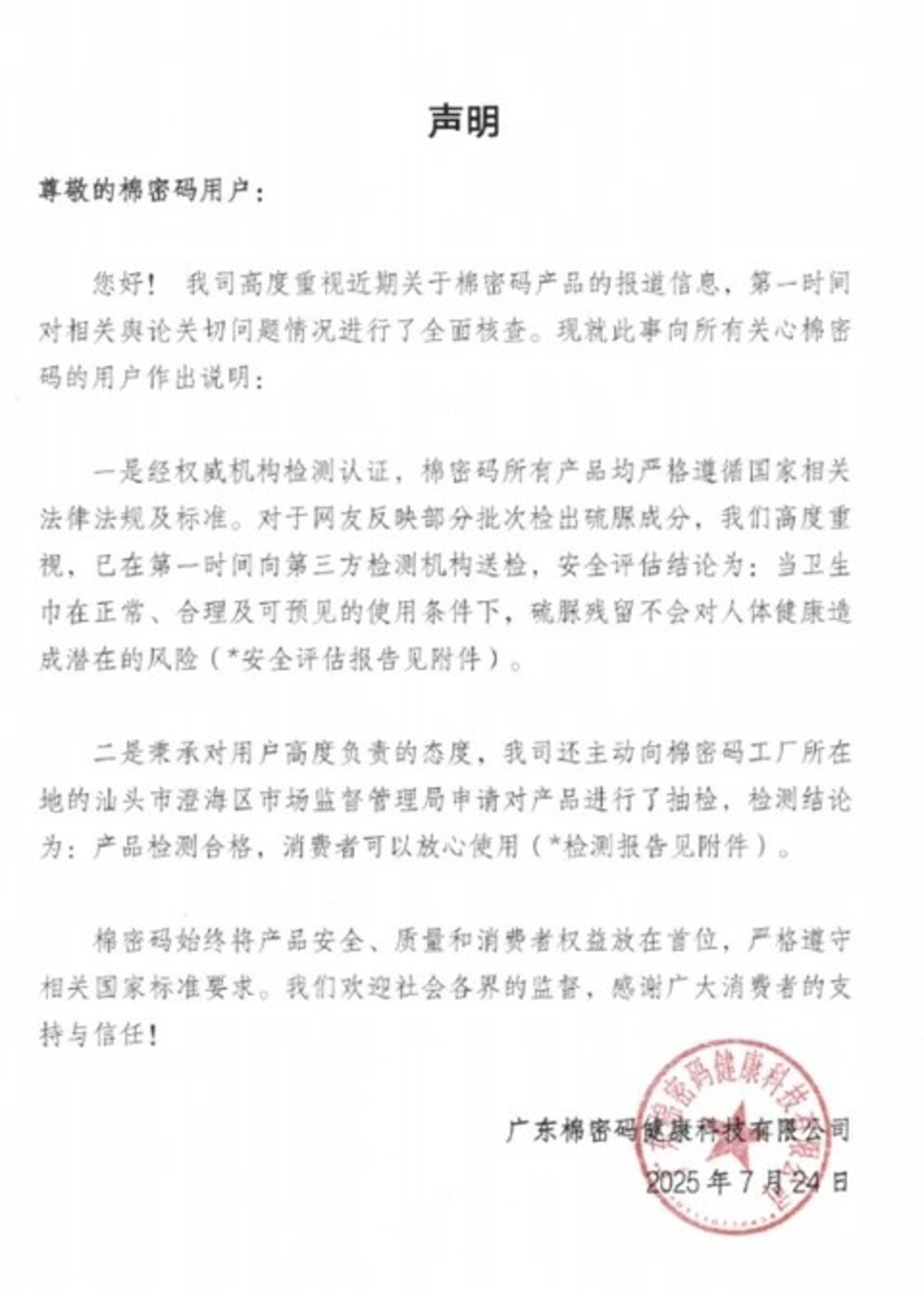 Trước làn sóng chỉ trích dữ dội từ dư luận, tài khoản Weibo chính thức của Cotton Secret đã đăng tải thông báo phản hồi. Đại diện thương hiệu kiên quyết khẳng định toàn bộ sản phẩm của họ đều tuân thủ nghiêm ngặt các quy định pháp luật và tiêu chuẩn quốc gia.
