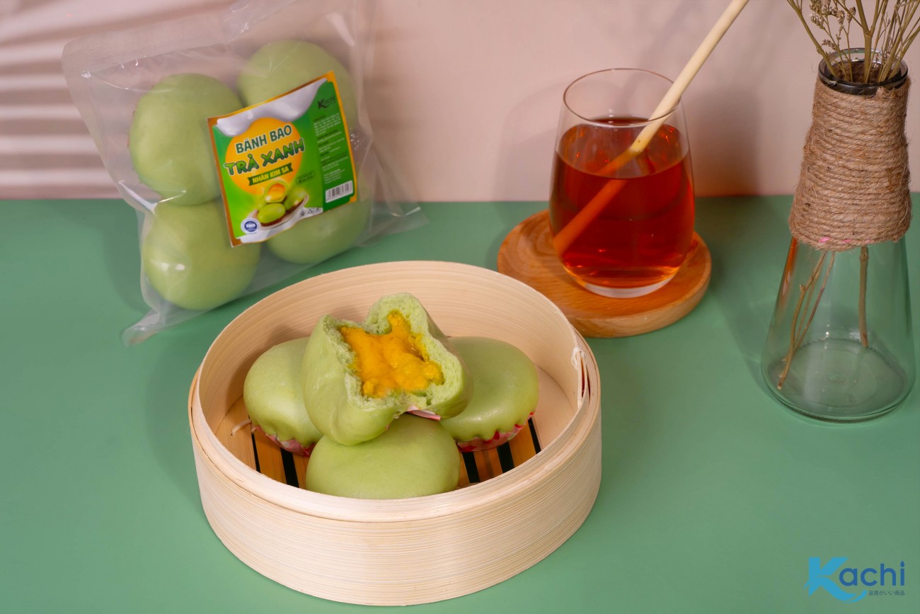 Đặt ngay hôm nay để thưởng thức Bánh Bao Trà Xanh Nhân Kim Sa Kachi thơm dịu – béo mịn – tan chảy đầy cuốn hút!