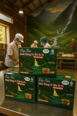 Bánh phồng cá hồi là sự kết hợp độc đáo giữa truyền thống và hiện đại. Tận dụng nguồn nguyên liệu cá hồi tươi tại Sa Pa, bánh được chế biến theo quy trình sạch, chiên phồng giòn tan mà vẫn giữ trọn vị ngọt tự nhiên của cá. Mỗi miếng bánh là một trải nghiệm thú vị – vừa giòn rụm, vừa đậm đà hương vị núi rừng. Bánh có thể dùng làm món snack cho trẻ nhỏ, ăn vặt cho người lớn, hoặc dùng làm món khai vị trong các bữa tiệc.