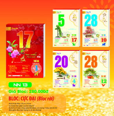 Bộ lịch NN13 với thiết kế rực rỡ, tươi mới, hình ảnh sinh động và chất liệu cao cấp, là lựa chọn tuyệt vời cho không gian sống, làm việc trong dịp Tết. Lịch có kích thước lớn và màu sắc nổi bật, tạo điểm nhấn cho phòng khách, văn phòng, sảnh tiếp khách.