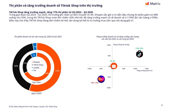 Trong 6 tháng đầu năm 2025, theo thống kế từ YouNet ECI, bốn nền tảng hàng đầu (Shopee, TikTok Shop, Lazada và Tiki) đã ghi nhận tổng giá trị giao dịch (GMV) đạt 222.100 tỷ đồng, tăng 23% so với cùng kỳ năm trước, với gần 1,9 tỷ sản phẩm được bán ra. Trong đó, TikTok Shop là nền tảng tăng trưởng nhanh nhất, chứng minh rằng trải nghiệm mua sắm qua video hiện đang là xu hướng chủ đạo.