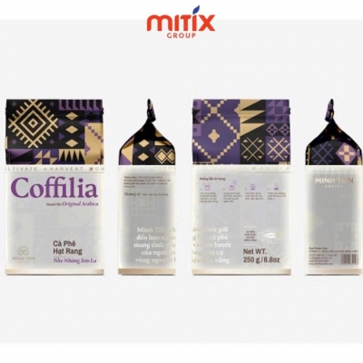• Quy cách đóng gói : Bao bì được thiết kế với hoạ tiết thổ cẩm đặc trưng của người dân tộc thiểu số, thân thiện môi trường, có nẹp miệng bằng nhựa và Van(Thụy Sĩ) chống mất mùi.