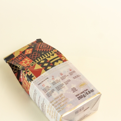 • Quy cách đóng gói : Bao bì được thiết kế với hoạ tiết thổ cẩm đặc trưng của người dân tộc thiểu số, thân thiện môi trường, có nẹp miệng bằng nhựa, có Zipper và Van(Thụy Sĩ) chống mất mùi.