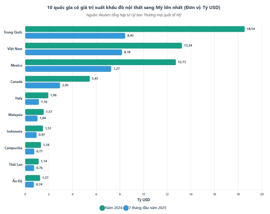 Kết quả là, Việt Nam đang trên đà vượt qua Trung Quốc để trở thành nhà cung cấp đồ nội thất chính cho thị trường Mỹ trong năm nay. Dữ liệu từ Mỹ cho thấy, trong 7 tháng đầu năm, kim ngạch xuất khẩu đồ nội thất của Việt Nam sang Mỹ đạt gần 8,2 tỷ USD, tăng tốc so với năm 2024. Trong khi đó, hàng xuất khẩu của Trung Quốc chậm lại, chỉ đạt 8,4 tỷ USD trong cùng kỳ.