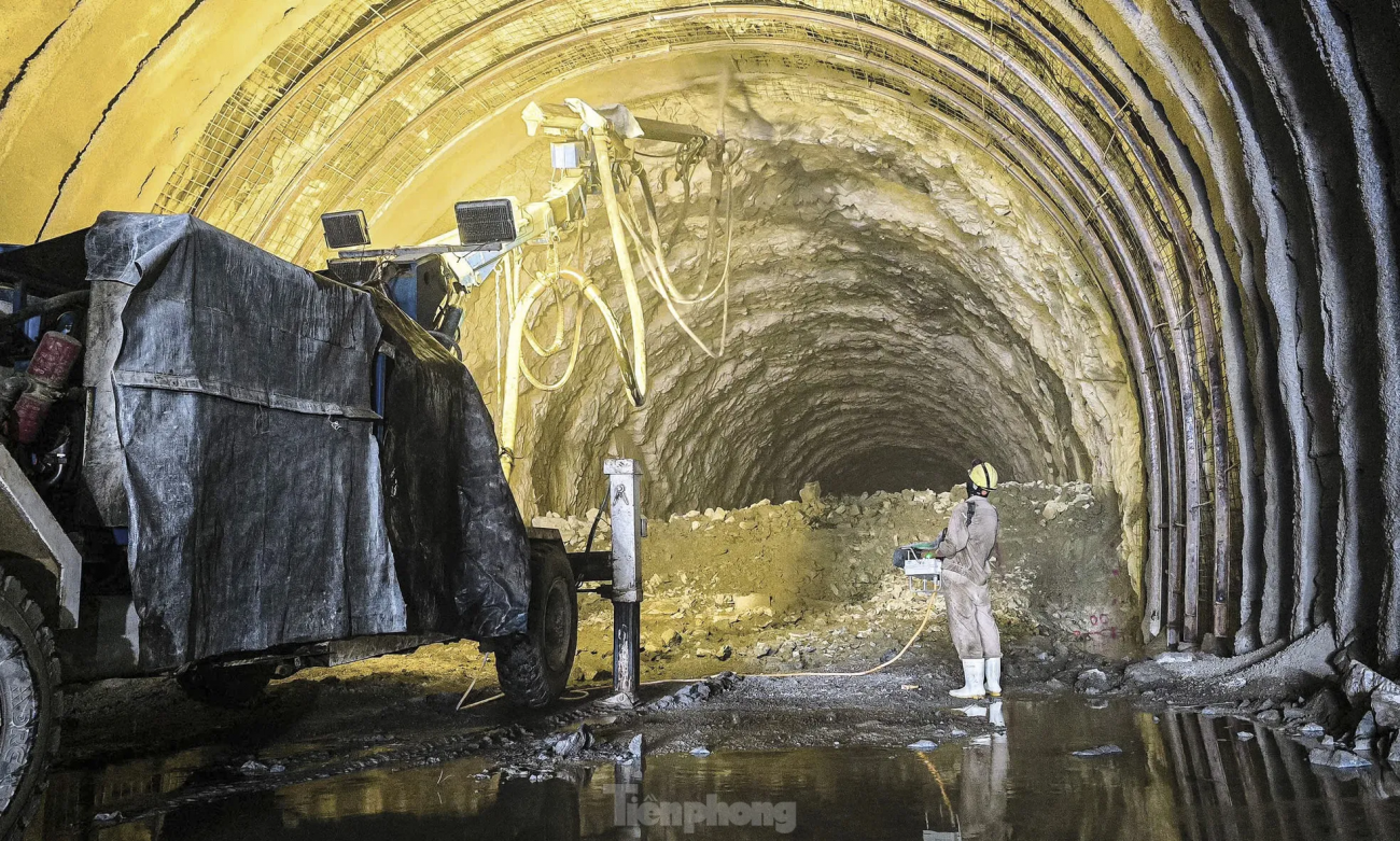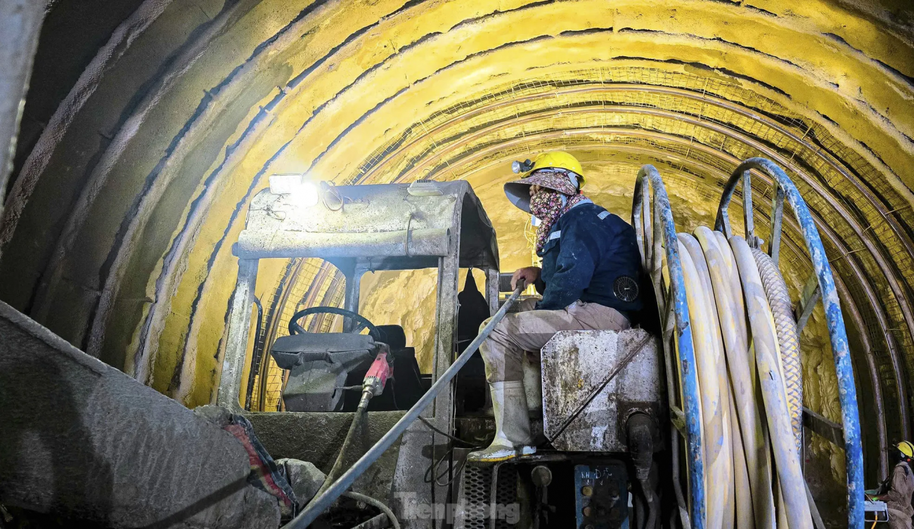 “Làm việc trong hầm không ảnh hưởng nhiều bởi thời tiết song khói bụi và môi trường bí bách hơn nên anh em phải mặc bảo hộ dày, đội mũ, đeo khẩu trang làm việc liên tục”, anh Cường (quê Thanh Hóa) chia sẻ. Trong hình công nhân, kỹ sư cùng nhiều thiết bị, máy móc, robot đào hầm hiện đại làm việc xuyên suốt ngày đêm.