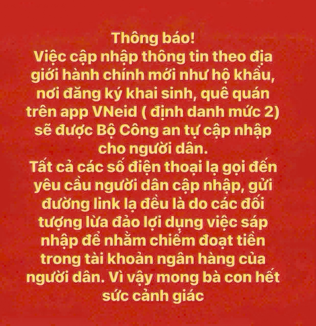 Công an phường Phương Liệt đã phát đi cảnh báo khẩn về thủ đoạn lừa đảo mới liên quan đến việc cập nhật thông tin theo địa giới hành chính trên ứng dụng VNeID. Theo đó, các đối tượng xấu mạo danh cán bộ nhà nước như cảnh sát khu vực, nhân viên hộ tịch gọi điện yêu cầu người dân truy cập đường link lạ hoặc tải ứng dụng VNeID giả mạo chứa mã độc. Mục đích của chúng là chiếm quyền điều khiển điện thoại, đánh cắp thông tin và tài sản. Cơ quan chức năng khẳng định, việc cập nhật thông tin trên VNeID sẽ được Bộ Công an tự động xử lý, người dân không cần thao tác.