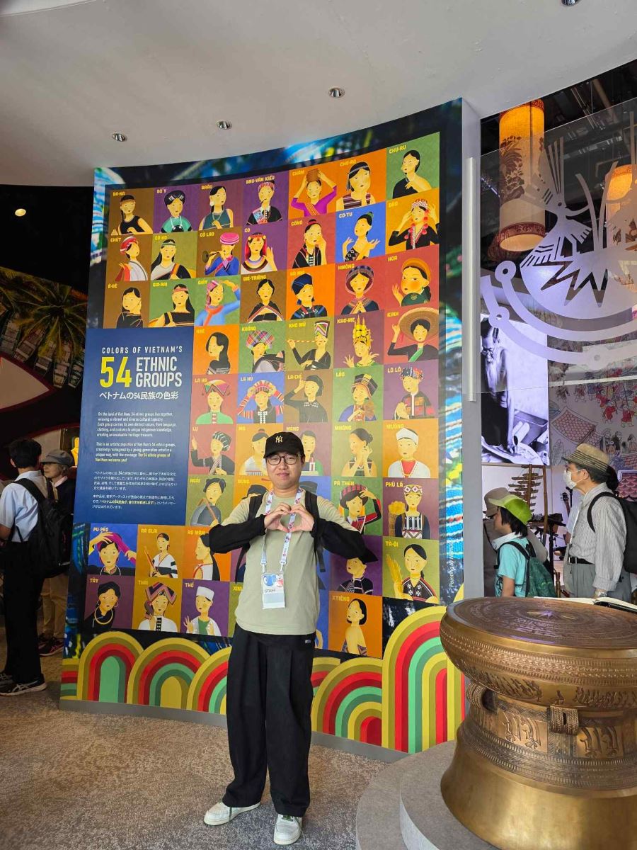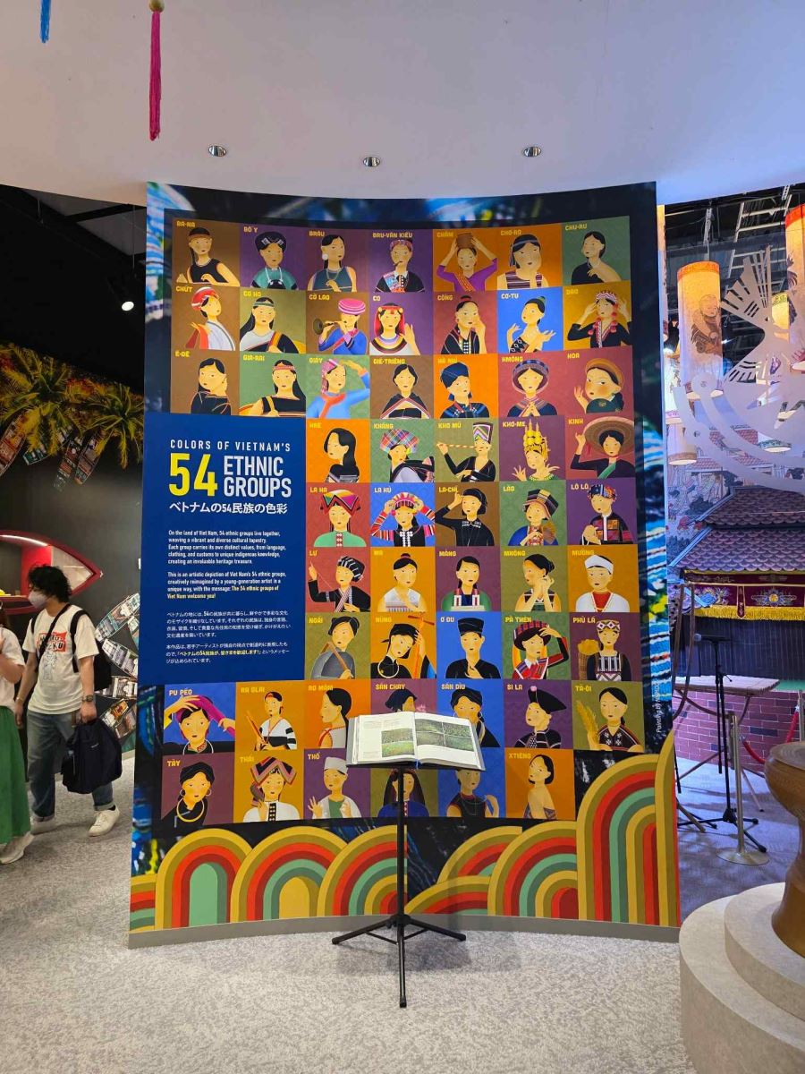 Không gian Nhà triển lãm Việt Nam được thiết kế đậm bản sắc, với chủ đề “Cùng nhau nuôi dưỡng tương lai”, mang đến trải nghiệm văn hóa đặc trưng và truyền thống dân tộc trong hình hài hiện đại. Tại đây, các tác phẩm tranh “54 Việt Tộc” hiện diện như điểm nhấn thị giác, gây ấn tượng mạnh với khách quốc tế.