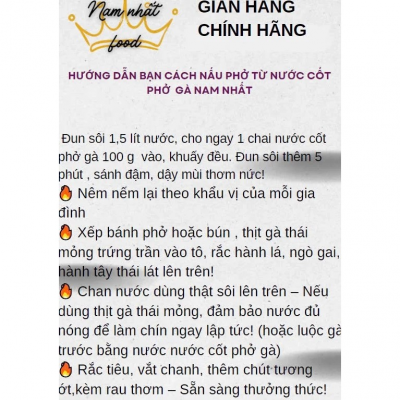 Giờ đây, chỉ với Nước Cốt Phở Gà Cô Đặc Nam Nhất, bạn có thể nấu ngay một nồi nước dùng chuẩn vị như ngoài hàng – nhanh chóng, tiện lợi, mà vẫn giữ trọn hương vị truyền thống!