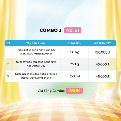 Combo 3 No51 Nước giặt xả 3,8kg, nước rửa chén và nước tẩy bồn cầu Usefull Day