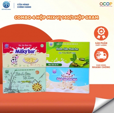 Combo 4 Hộp Bánh Sữa Mix Vị Chị Vàng Milk 140g là sự kết hợp hài hòa giữa bốn hương vị được yêu thích: Vị Xưa truyền thống, Phô Mai béo ngậy, Matcha thanh mát và Milky Bar thơm lừng, mang đến trải nghiệm thưởng thức phong phú và hấp dẫn. Đây là lựa chọn lý tưởng cho những ai muốn đổi vị mỗi ngày, vừa thơm ngon vừa bổ dưỡng. Trong đó: