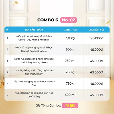 Combo 6 No02 Nước giặt xả hương huyền bí 3,8kg, nước rửa tay hương hoa, nước rửa chén hương chanh, tẩy trắng tẩy mốc, tẩy bồn cầu và nước lau kính Usefull Day