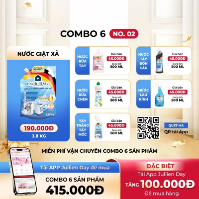 Combo 6 No02 Nước giặt xả, nước rửa tay, nước rửa chén, nước tẩy trắng tẩy mốc, nước tẩy toilet và nước lau kính