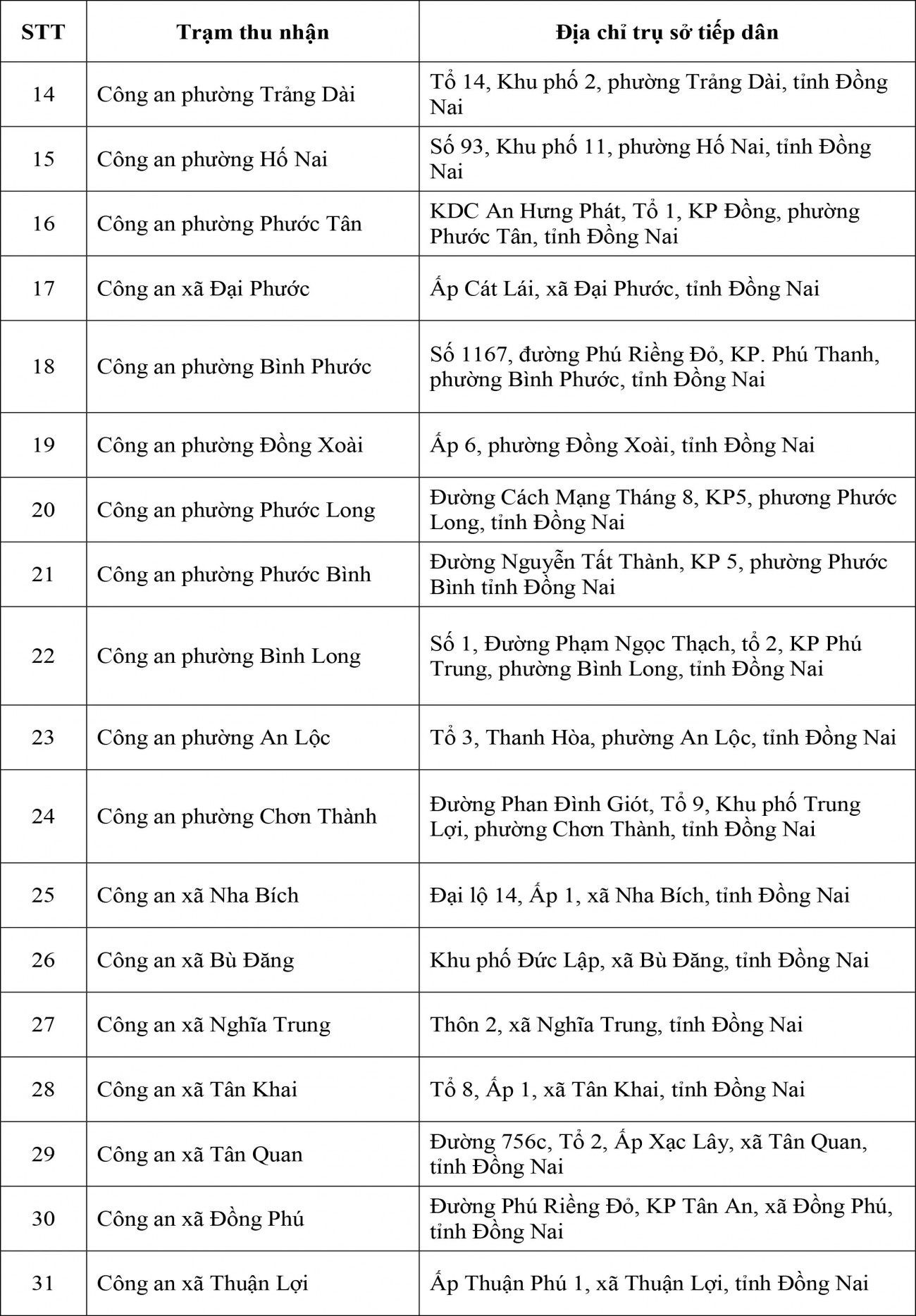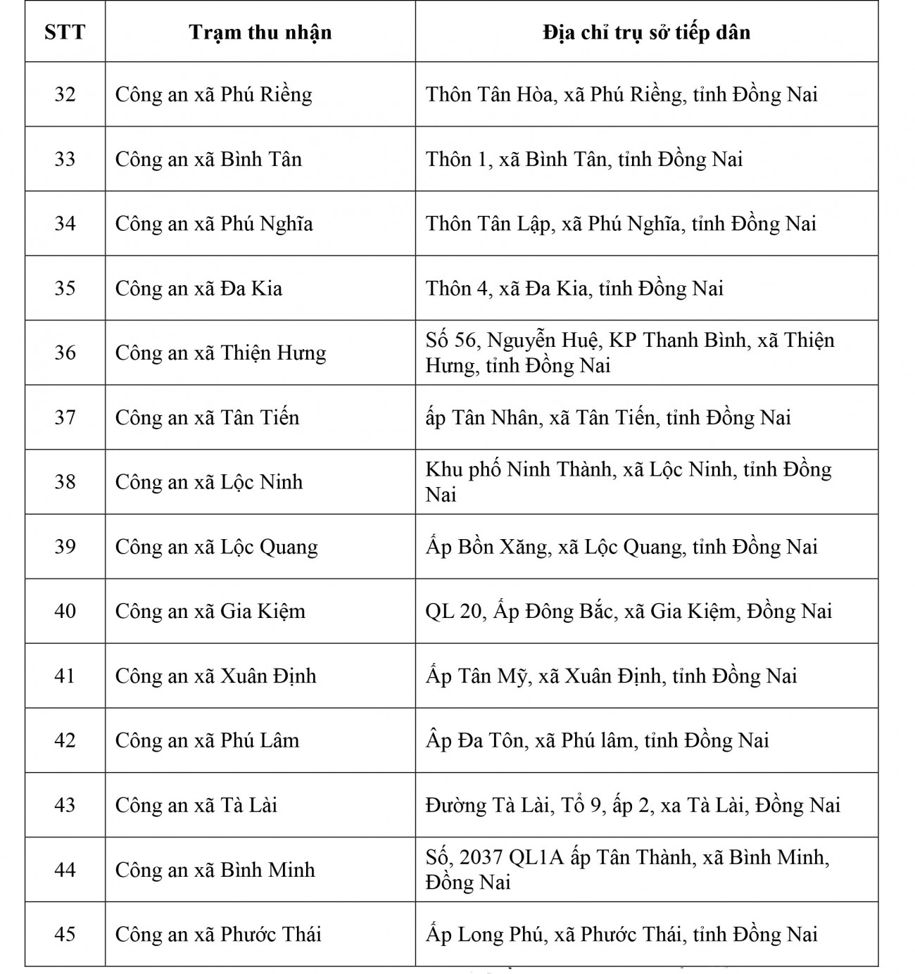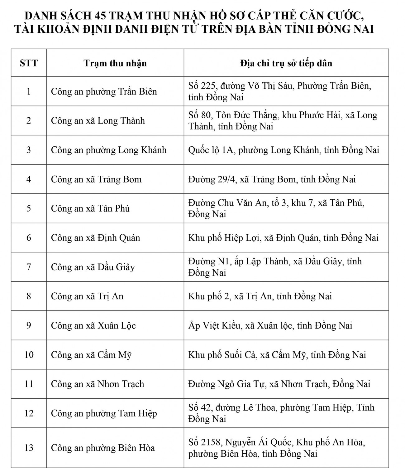 Danh sách 45 trạm thu nhận hồ sơ cấp thẻ căn cước, tài khoản định danh điện tử trên địa bàn tỉnh Đồng Nai như sau: