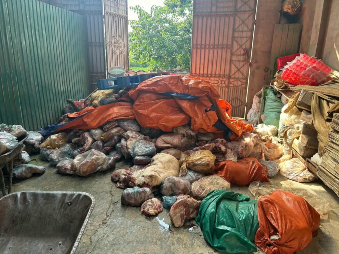 Cụ thể, lực lượng chức năng đã phát hiện 2,7 tấn thịt lợn chưa qua sơ chế, được phủ bạt, đã ngả màu và bốc mùi hôi thối. Ngoài ra, lực lượng chức năng cũng phát hiện khoảng 2 tấn thịt lợn khác được bảo quản trong tủ cấp đông và hơn 500kg lạp xưởng, thịt sấy khô, thịt hun khói thành phẩm không có nhãn mác, không đảm bảo điều kiện bảo quản theo quy định.