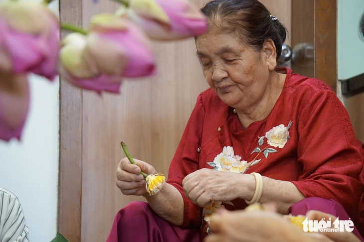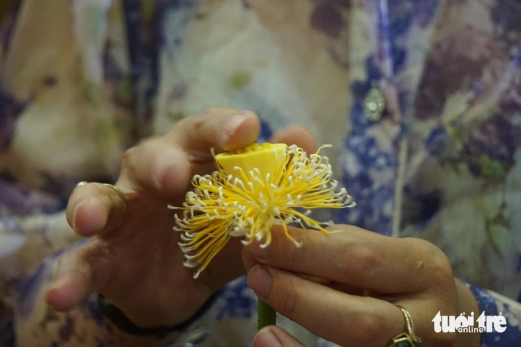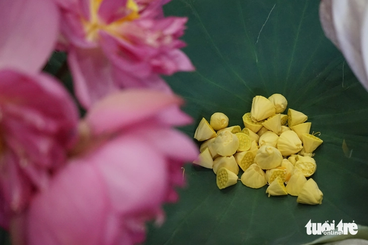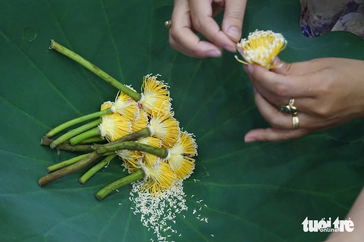 Khâu lấy gạo sen là công đoạn chỉ dành cho nghệ nhân. Hạt gạo sen li ti, mỏng mảnh, chỉ nghệ nhân mới lấy được thật nhanh lại không bị nát. Tách cánh sen, khâu làm mẫu mã, hút chân không thì các bạn trẻ có thể làm được.
