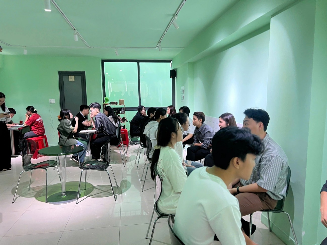 Người hướng dẫn tên Tâm đón nữ sinh lên tầng 2 của quán cà phê, nơi có hàng chục người đang dạy làm giàu. Không gian hẹp, chật kín người, không khí ồn ào như đàn ong vỡ tổ.