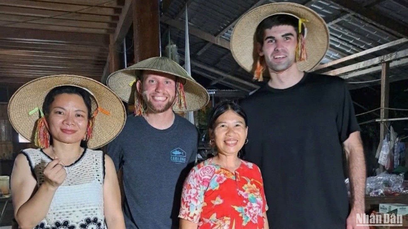 Dưới mái hiên nhà sàn truyền thống, chủ và khách rôm rả chuyện trò, tạo những cảm xúc đặc biệt trong hành trình du lịch. Bà Huệ rất chủ động và thân thiện, đã nhiều lần hướng dẫn khách ngoại quốc làm nón thành công.