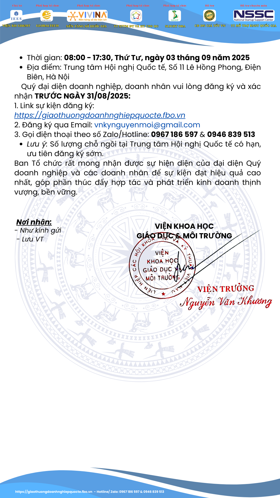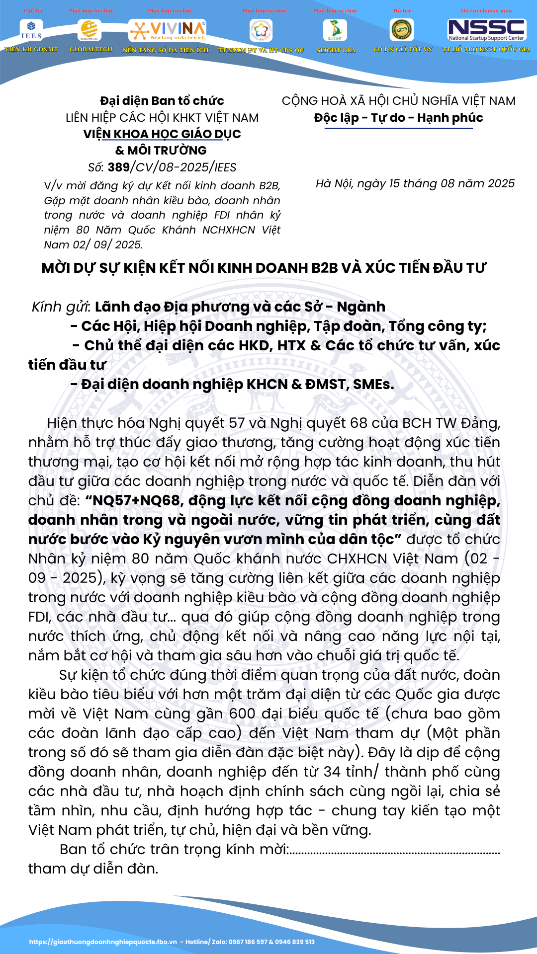 Hà Nội sẽ là tâm điểm của cộng đồng doanh nghiệp trong và ngoài nước khi Diễn đàn Kết nối Kinh doanh B2B và Xúc tiến Đầu tư chính thức diễn ra vào ngày 03/09/2025 tại Trung tâm Hội nghị Quốc tế (11 Lê Hồng Phong, Ba Đình). Sự kiện được tổ chức nhân dịp kỷ niệm 80 năm Quốc khánh nước CHXHCN Việt Nam, quy tụ gần 500 doanh nghiệp từ 34 tỉnh/thành, hơn 100 doanh nhân kiều bào cùng hàng trăm đại biểu quốc tế.