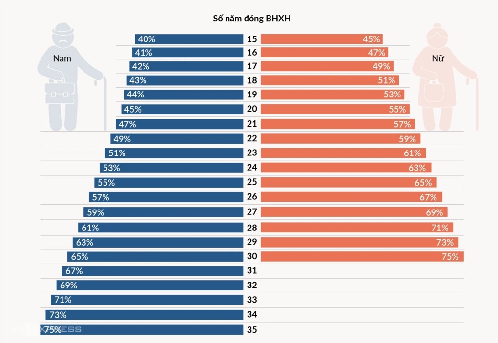 Mức hưởng với lao động nam bằng 45% bình quân tiền lương làm căn cứ đóng BHXH tương ứng 20 năm tham gia. Mỗi năm đóng sau đó được cộng 2% cho đến khi đạt tỷ lệ hưởng tối đa 75%, tương ứng 35 năm tham gia. Trường hợp lao động nam tham gia từ đủ 15 năm đến dưới 20 năm, lương hưu hàng tháng bằng 40% bình quân tiền lương tháng làm căn cứ đóng BHXH, tương ứng 15 năm. Sau đó cứ thêm mỗi năm đóng thì tính thêm 1%.