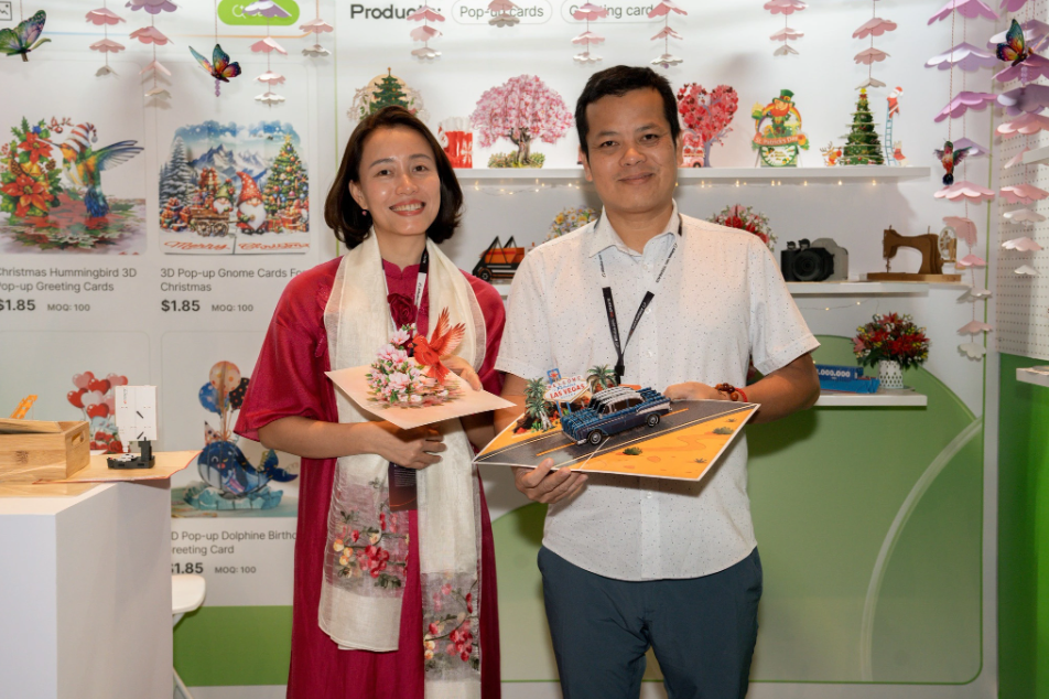 Một đại diện khác, Công ty CP Thiệp nổi và thủ công mỹ nghệ Việt Nam mang đến các mẫu thiệp 3D pop-up tinh xảo. Sau 12 năm kiên trì duy trì kênh phân phối trực tuyến, HMG đã xây dựng được thương hiệu ổn định, đặc biệt tại Mỹ - nơi sản phẩm thiệp chúc mừng có nhu cầu cao. Bà Phùng Minh Thủy, Nhà sáng lập kiêm Phó giám đốc kinh doanh, nhấn mạnh: "Điều quan trọng không chỉ là bán sản phẩm, mà còn lan tỏa thông điệp tình yêu và hạnh phúc qua từng tấm thiệp".
