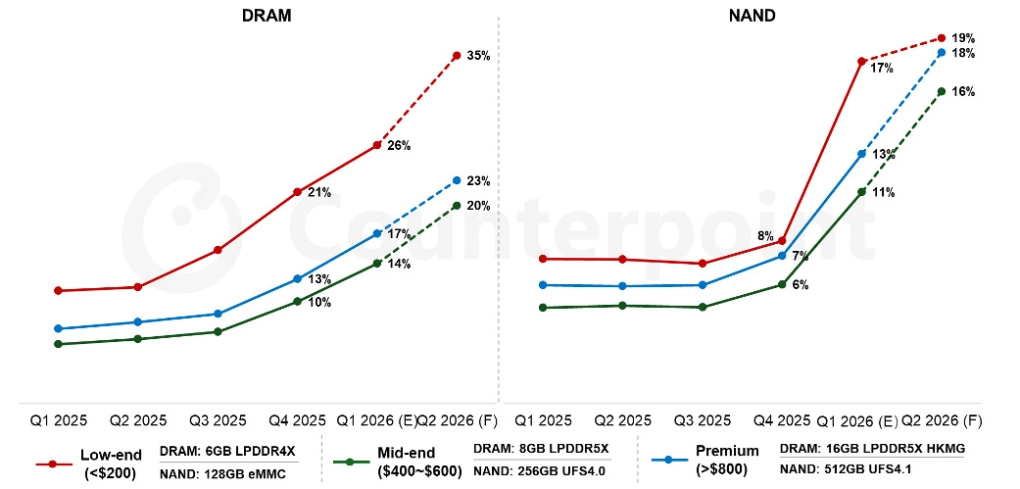Theo Counterpoint, kể từ tháng 3, smartphone mới ra mắt tại Trung Quốc tăng giá trung bình 15-25% so với thế hệ 2025. Trong quý đầu năm, chip nhớ được ước tính chiếm đến 43% tổng chi phí linh kiện của smartphone dưới 200 USD với cấu hình điển hình RAM 6 GB và bộ nhớ trong 128 GB, tăng 14% so với cuối 2025. Điện thoại giá rẻ vốn có biên lợi nhuận thấp, dễ bị ảnh hưởng khi linh kiện biến động. Với smartphone tầm trung và cao cấp, tỷ trọng chi phí chip nhớ trong tổng giá linh kiện tăng khoảng 9%.
