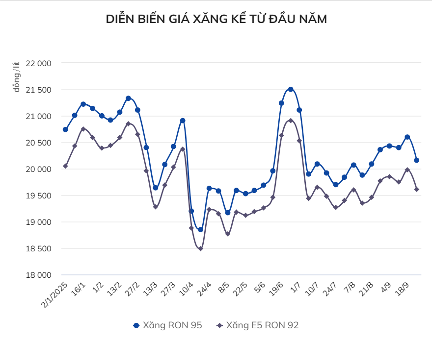 Từ 15h ngày 25/9, giá xăng RON 95 giảm 440 đồng/lít xuống 20.160 đồng/lít. Từ đầu năm, mặt hàng này đã có 22 lần tăng giá và 18 lần giảm giá.