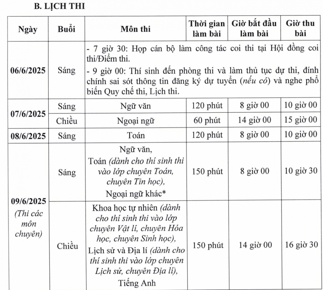 Theo lịch, giờ làm bài thi môn ngữ văn sẽ kết thúc lúc 10h. 14h chiều nay, thí sinh làm bài thi môn tiếng Anh. 8h sáng ngày 8/6, thí sinh đại trà kết thúc kỳ thi lớp 10 với môn toán. Riêng thí sinh thi chuyên tiếp tục thi ngày 9/6.