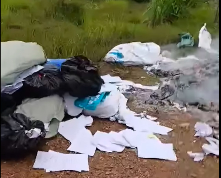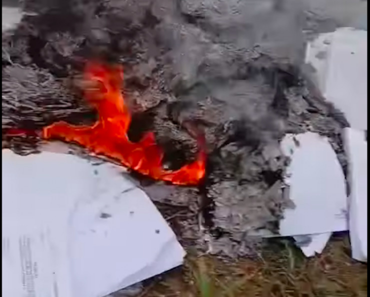 Giữa bãi đất, đám cháy bốc khói, kèm theo mùi khét, trong đó vẫn còn nhiều giấy tờ chưa kịp cháy còn nguyên dấu đỏ.