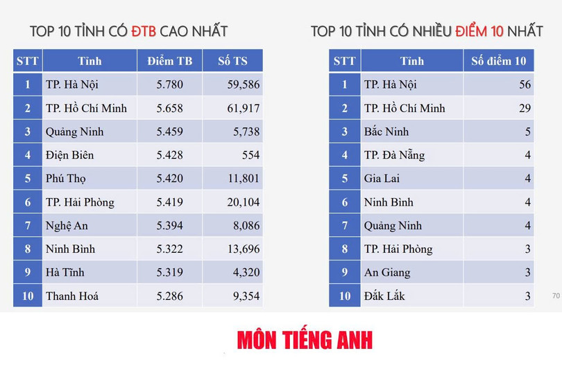 Môn tiếng Anh có điểm trung bình là 5,38. Có 141 điểm 10, có 2 điểm 0. Theo đại diện Bộ Giáo dục và đào tạo, phổ điểm môn tiếng Anh đẹp là một bất ngờ với cả hội đồng phân tích phổ điểm. Hà Nội, TP.HCM là hai địa phương có nhiều điểm 10 tiếng Anh nhất.