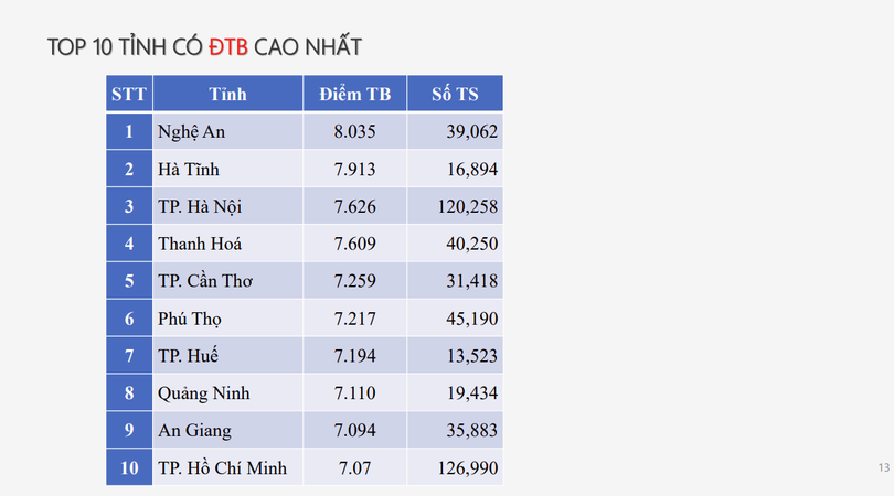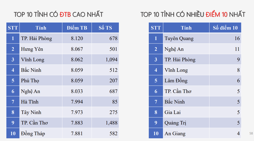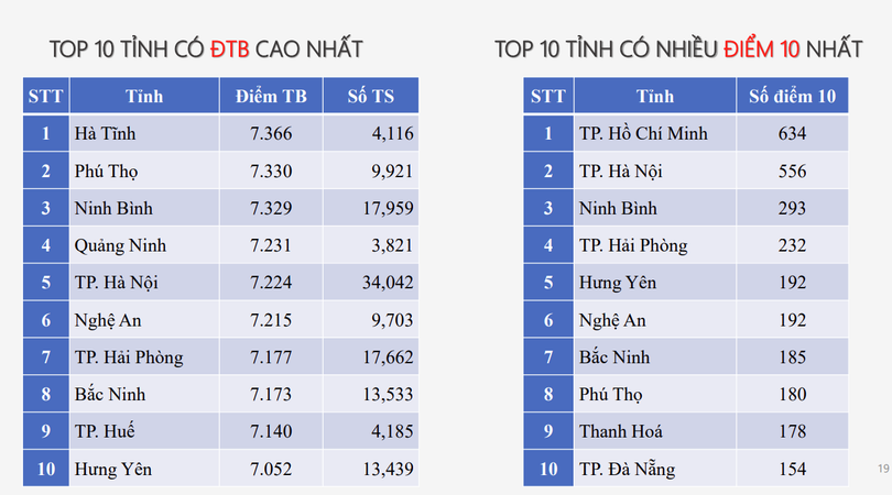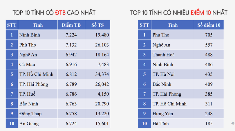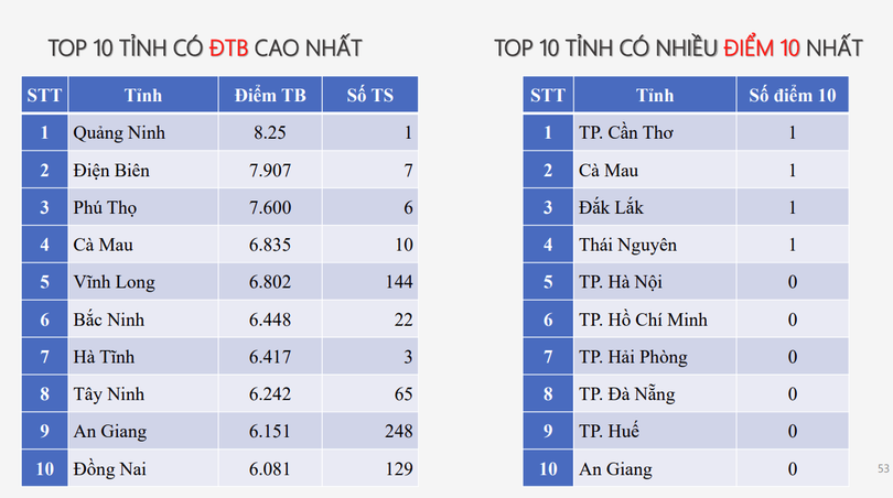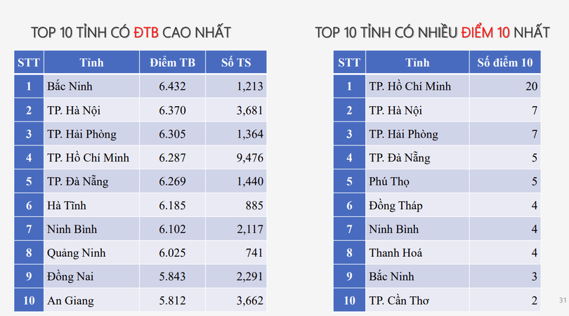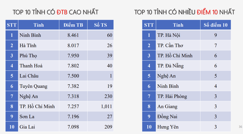 Địa lý: Không lọt top 10 tỉnh có điểm trung bình cao nhất nhưng lọt top 10 tỉnh có nhiều điểm 10 nhất (185 điểm 10)