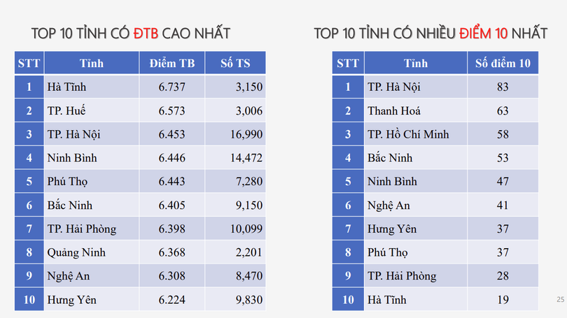 Theo báo cáo thống kê và phân tích phổ điểm thi năm 2025 của Bộ GD&ĐT, Hà Tĩnh có 3 môn điểm trung bình cao nhất cả nước; 11/12 môn lọt top 10 tỉnh có điểm trung bình cao nhất cả nước.