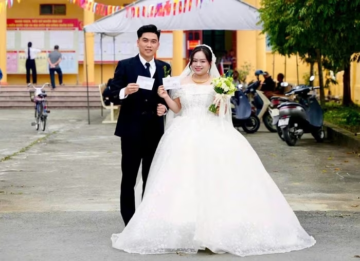 Điều đặc biệt của ngày trọng đại này không chỉ là khoảnh khắc đôi bạn trẻ về chung một nhà, mà còn ở hành động ý nghĩa ngay sau các nghi thức cưới. Trong trang phục truyền thống, cô dâu và chú rể cùng đến khu vực bỏ phiếu tại địa phương để thực hiện quyền và nghĩa vụ công dân.