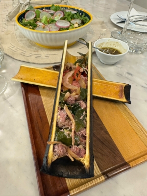 Heo rừng ống tre là món ăn mang đậm dấu ấn ẩm thực truyền thống Việt Nam, được chế biến theo phương pháp dân dã nhưng tinh tế. Thịt heo rừng được tuyển chọn kỹ, ướp gia vị đặc trưng và hấp hoặc nấu chín trực tiếp trong ống tre tự nhiên. Cách chế biến này giúp thịt chín đều từ từ, giữ trọn vị ngọt tự nhiên của thịt, đồng thời thấm sâu gia vị và hòa quyện cùng hương tre khói dịu nhẹ đặc trưng.
