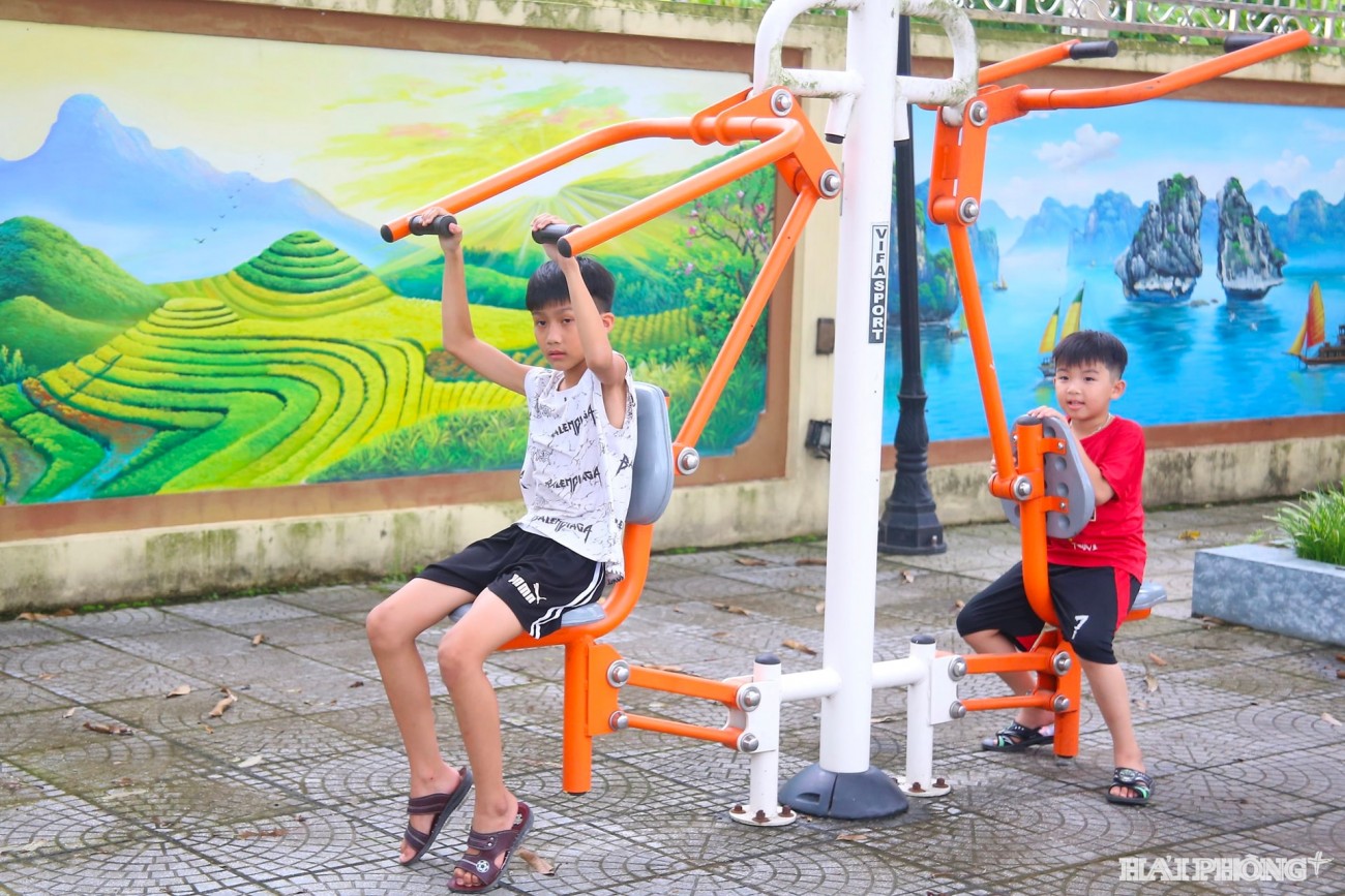 Khu vực khuôn viên nhà sách còn được bố trí nhiều thiết bị thể dục ngoài trời để mỗi buổi chiều người dân địa phương đến vui chơi, rèn luyện sức khoẻ