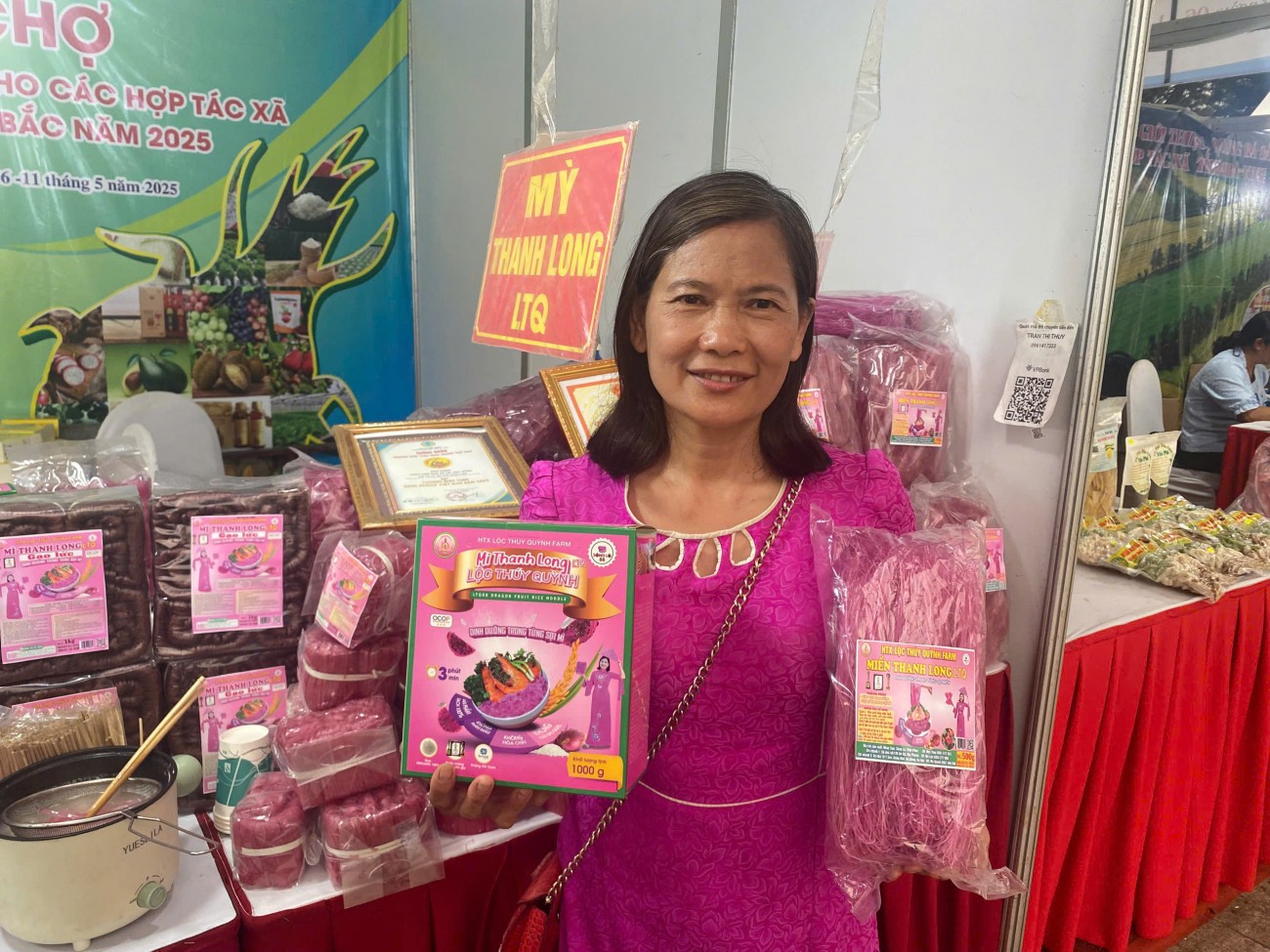 Tại sự kiện, nhiều sản phẩm nông nghiệp chất lượng cao đã thu hút sự quan tâm của người tiêu dùng và đối tác. Chị Trần Thị Thúy, giám đốc hợp tác xã Lộc Thúy Quỳnh Farm (Vĩnh Phúc), chia sẻ cùng bà Đàm Huyền Ngọc, đại diện nền tảng số Quốc gia VIVINA: “Mì Thanh long của hợp tác xã đã được công nhận OCOP 3 sao, đồng thời đạt danh hiệu Thương hiệu Vàng Nông nghiệp Việt Nam. Sản phẩm đã có mặt tại thị trường Trung Quốc và hiện đang trong quá trình hoàn thiện hồ sơ để tiếp cận các thị trường như Mỹ, Nhật Bản, Pháp, và những quốc gia nổi tiếng khắt khe về tiêu chuẩn.”