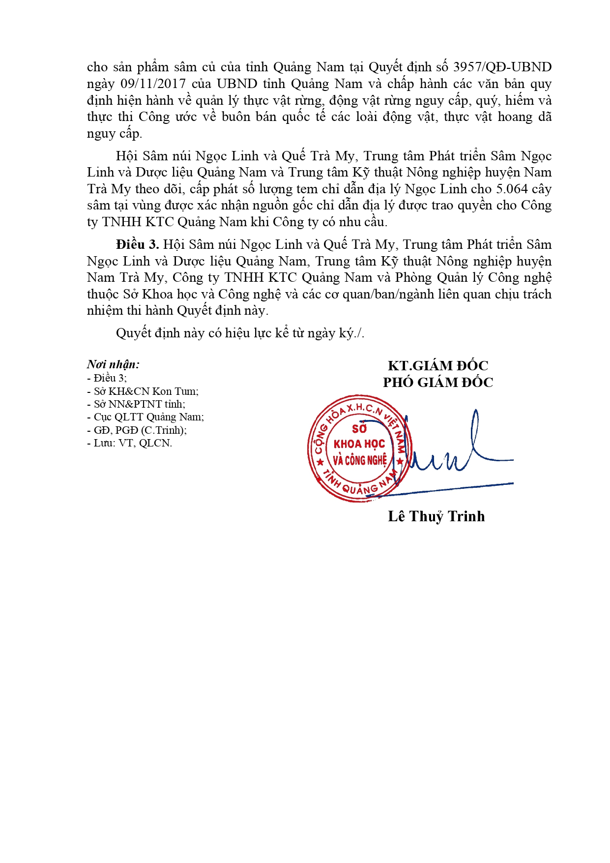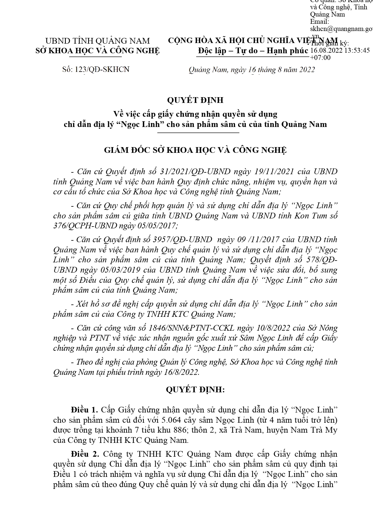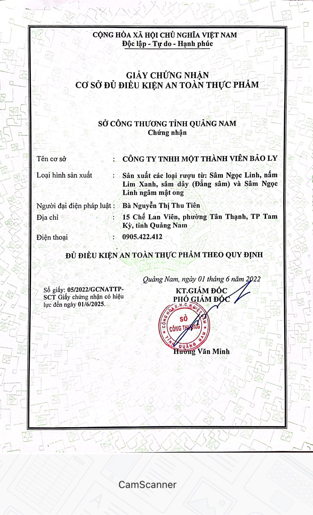UBND Tp Tam Kỳ đã cấp chứng nhận Vệ sinh ATTP cho Sâm Ngọc Linh Bảo Ly