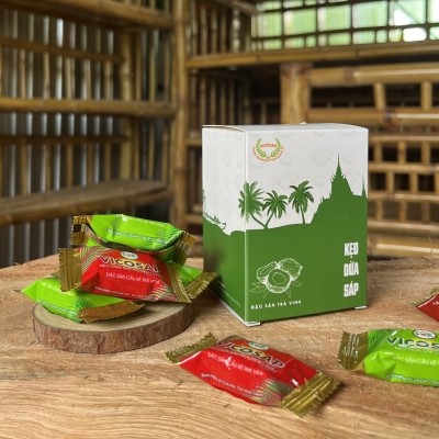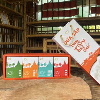 Hộp quà "Vàng trắng Trà Vinh" là sự kết hợp hoàn hảo của các sản phẩm từ dừa sáp, mang đến trải nghiệm ẩm thực độc đáo: