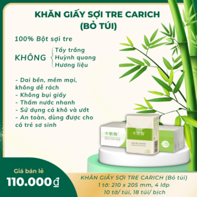 Công dụng: Khăn giấy sợi tre CARICH dùng trong khi ăn uống (lau miệng, lau chén dĩa, lau mặt bàn,...); vệ sinh cá nhân sau khi đi vệ sinh; có thể tận dụng cho nhiều mục đích khác: lau tay, lau mồ hôi, lau son, lớp trang điểm, thấm hút khi chế biến các món nhiều dầu mỡ, lau cốc chén đũa trước khi ăn uống,…