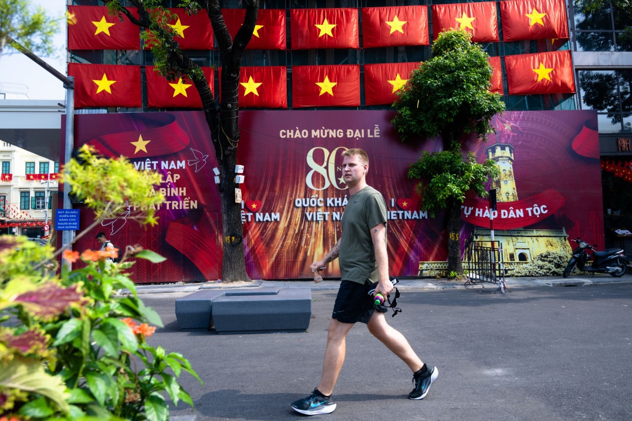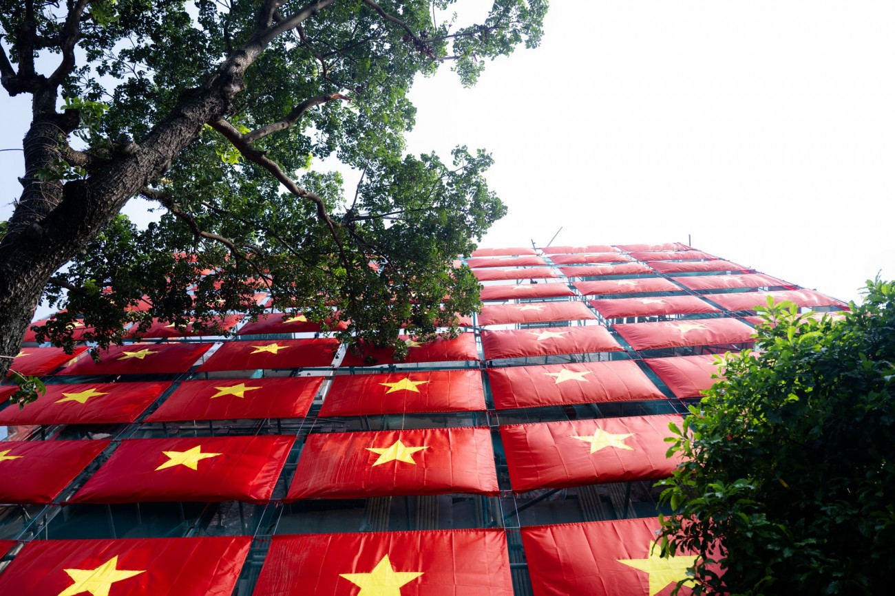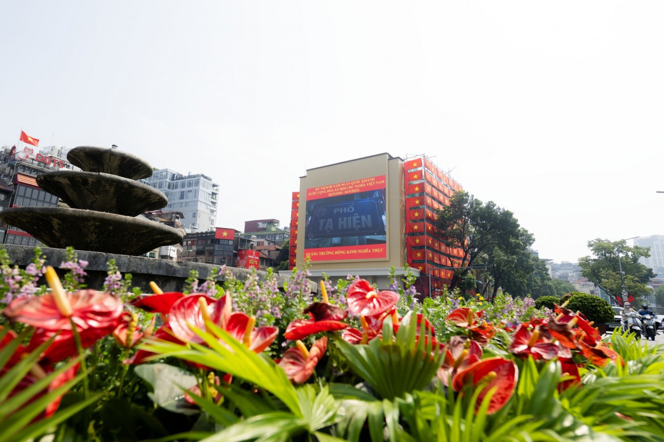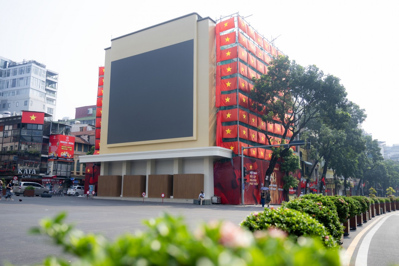 Khu vực từng là tòa nhà Hàm Cá Mập nay được lắp đặt màn hình LED khổ lớn, vừa phục vụ công tác tuyên truyền, quảng bá hình ảnh, vừa tạo điểm nhấn thị giác ấn tượng. Mặt tiền tòa nhà hướng ra hồ Gươm cũng đang được chỉnh trang, đồng thời được trang hoàng rực rỡ với hàng trăm lá cờ Tổ quốc.