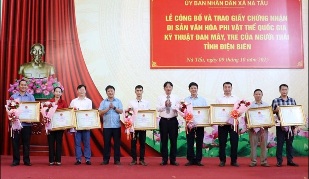 Chiều 9.10, xã Nà Tấu, tỉnh Điện Biên đã tổ chức công bố, trao chứng nhận di sản văn hóa phi vật thể quốc gia kỹ thuật đan mây, tre của người Thái tỉnh Điện Biên cho đại diện 31 xã, phường trên địa bàn đang lưu giữ và thực hành kỹ thuật đan mây, tre của người Thái.