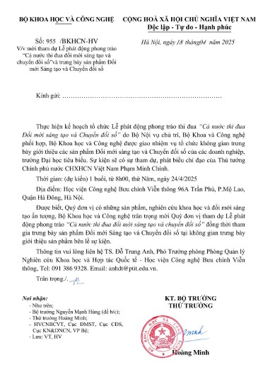 Ngày 24/04/2025, lễ phát động phong trào "Cả nước thi đua đổi mới sáng tạo và chuyển đổi số" sẽ diễn ra tại Học viện Công nghệ Bưu chính Viễn thông (96A Trần Phú, phường Mộ Lao, Quận Hà Đông, Hà Nội). Sự kiện này không chỉ là dịp để giới thiệu các sản phẩm công nghệ tiên tiến, mà còn là một bước tiến quan trọng trong việc thúc đẩy tinh thần đổi mới sáng tạo và chuyển đổi số tại Việt Nam.