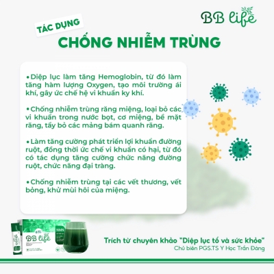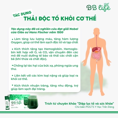 BB Life: Cung cấp diệp lục và NMN giúp chống oxy hóa, thanh lọc gan – thận – máu, hỗ trợ tái tạo tế bào và làm chậm lão hóa.