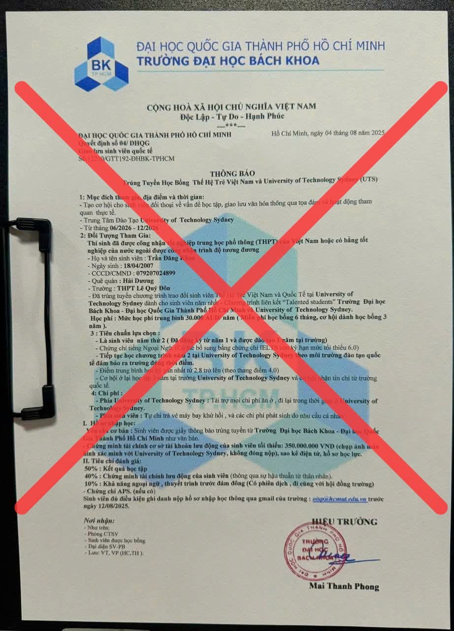 Trường đại học Bách khoa (thuộc Đại học quốc gia TP.HCM) vừa phát cảnh báo về việc lừa đảo online mạo danh Nhà trường phát tán thông báo giả với tiêu đề “Học bổng Thế hệ trẻ Việt Nam và University of Technology Sydney” để triển khai sâu hơn thông báo lừa đảo trước đó hồi tháng 6/2025 “Trúng tuyển chương trình trao đổi sinh viên Việt Nam và Quốc tế” với Đại học Công nghệ Sydney (UTS).