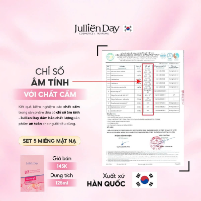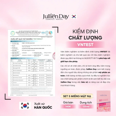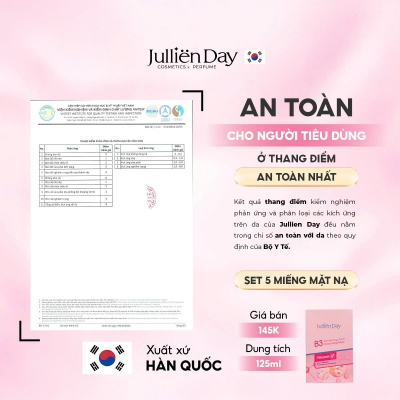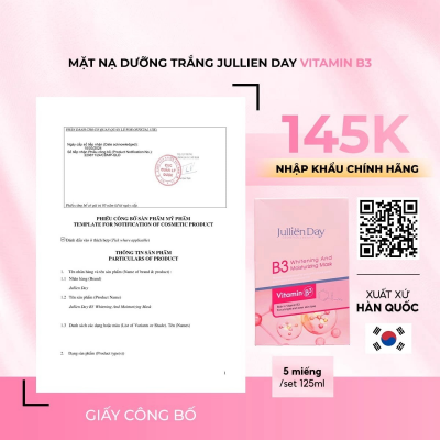 Sản phẩm Mặt nạ dưỡng trắng Vitamin B3 Jullien Day được nhập khẩu chính hãng từ Hàn Quốc, sản phẩm được kiểm nghiệm và được Bộ Y tế cấp phép.