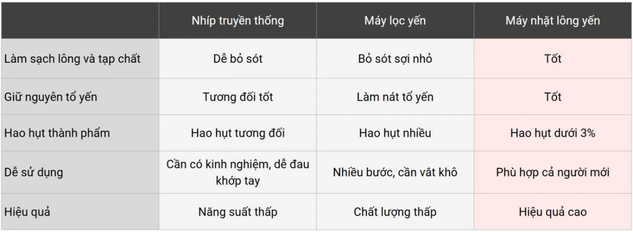 Máy giúp tăng năng suất làm sạch lên gấp nhiều lần, giảm hao hụt, và giữ nguyên cấu trúc tự nhiên của tổ yến, đồng thời tránh nhiễm bẩn ngược trong suốt quá trình xử lý.