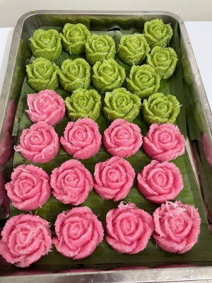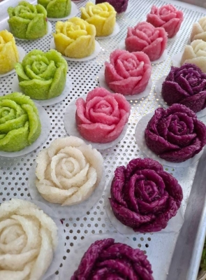 Mẹt xôi được tạo hình bông hoa lớn rực rỡ, từng lớp xôi xếp xen kẽ tinh tế. Khi mở mẹt ra, hương thơm lan tỏa hòa quyện giữa nếp dẻo, lá cẩm, gấc và nghệ – tạo nên một bản hòa ca hương vị truyền thống.