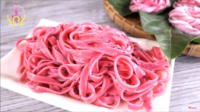 Miến thanh long Lộc Thủy được sản xuất từ bột củ dong kết hợp với nước ép thanh long ruột đỏ tươi, tạo nên sắc đỏ tự nhiên độc đáo và hấp dẫn.