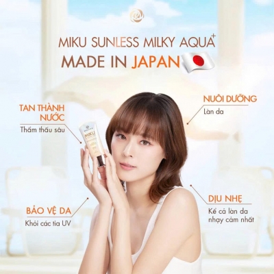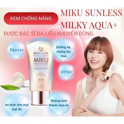Sữa chống nắng Miku Sunless Milky Aqua + đến từ thương hiệu mỹ phẩm Rosegold Global Co.,Ltd sản xuất tại nhà máy Seflor, Nhật Bản là kem chống nắng quang phổ rộng được sản xuất theo dây chuyền công nghệ tiên tiến nhất với chỉ số chống nắng SPF 50+ PA++++ bảo vệ da toàn diện khỏi những tác nhân gây hại từ môi trường